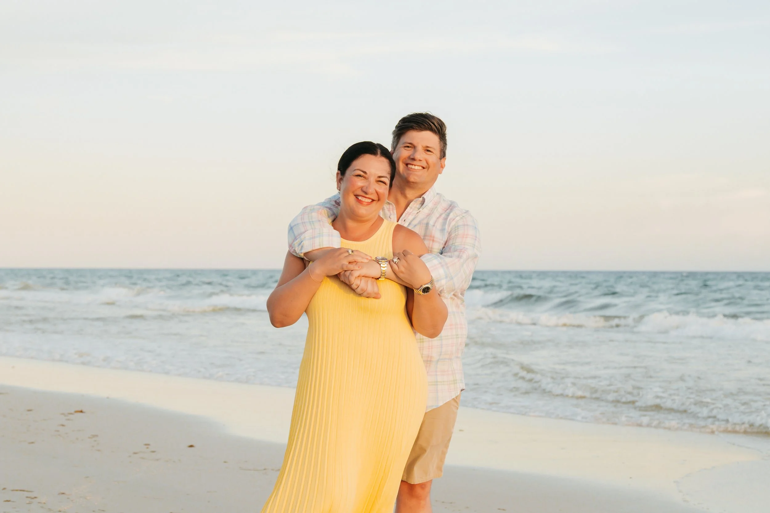 A smiling couple standing on a beach with ocean waves in the background, embracing each other.